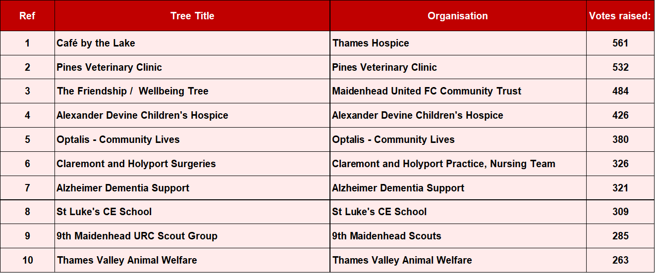 The immediate runners up were, in order: TVAP: Teddies take over the Thames Valley Adventure Playground, Thames Hospice, Claremont and Holyport Practice, Nursing Team, Sing, Choirs of Angels", The Wellbeing Tree (Maidenhead United Community Trust , Guess the Film by Craft Coop, Pines Veterinary Clinic, Christians against poverty, and If you want a better world you can make it. Well done everyone!